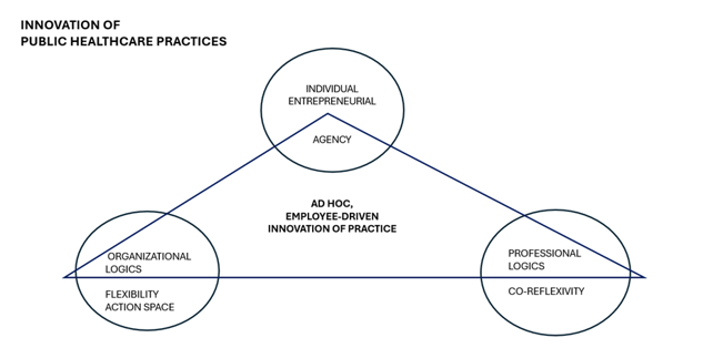 Figur: Innovasjon av praksis oppstår i skjæringspunktet mellom; individuell handlingskraft, felles refleksjoner og organisatorisk handlingsrom.